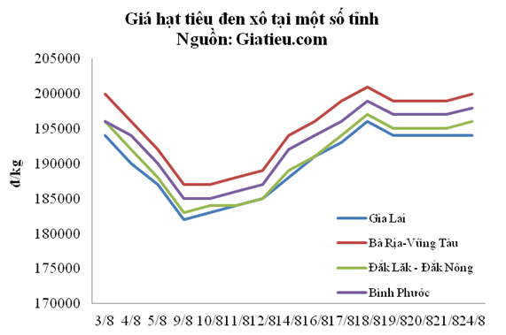 Tính đến ngày 24/8, giá thu mua tiêu tại các tỉnh trồng tiêu trọng điểm Gia Lai/Bà Rịa-Vũng Tàu/Đắk Lắk/Bình Phước, lần lượt ở mức 194/200/196/198 nghìn đồng/kg, trung bình giảm 12.000 đ/kg so với tháng trước.