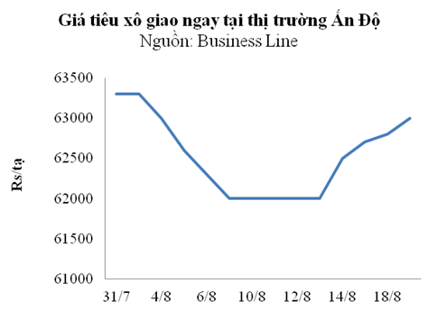 Các nhà xuất khẩu là những người mua duy nhất, trong khi không có người bán ở các thị trường chính do họ giữ hàng với hy vọng giá cao hơn trong mùa vụ tới. Các nhà tái chế đã được báo cáo là mua ‘hạt tiêu bị cáo buộc nhiễm độc’ và bán nó cho các nhà xuất khẩu. Nhu cầu trong nước đã không tăng do nhiều trung tâm phía bắc Ấn Độ có hàng tồn kho với số lượng nhỏ tiêu nhiễm độc. Ngày 19/8, 10 tấn tiêu bán thành phẩm được giao dịch mức 645 Rs/kg. Giá giao ngay tăng lên 63.000 Rs/tạ (tiêu xô) và 66.000 Rs/tạ (tiêu chọn). Các hợp đồng giao tháng chín trên IPSTA tăng lên mức 68.500 Rs/tạ. Thị trường nước ngoài đã cho thấy một xu hướng dễ dàng hơn. Các nhà xuất khẩu báo cáo đã nhập khẩu tiêu 525 GL của Sri Lanka ở mức 8.950 USD/tấn. Indonesia cung cấp tiêu Lampong Asta ở mức 10.000 USD/tấn C&F Ấn Độ. Việt Nam chào bán tiêu V Asta ở mức 10.200 USD tấn, trong khi Brazil Asta ở mức 9.450 USD/tấn (FOB). Giá xuất khẩu của Ấn Độ ở mức 10.450 USD/tấn C&F đối với châu Âu và 10.700 USD/tấn cho Mỹ.